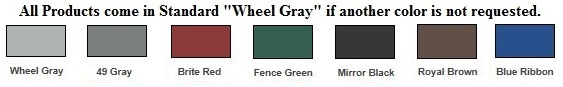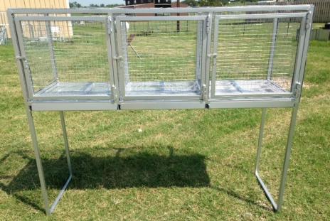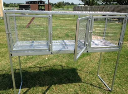 | Made in sets of 3 cages, each cage is 2' x 2' x 2'. They are situated 3' off the ground with removable trays for easy cleaning. Overall dimensions are 5' tall x 6' long x 2' deep. Made with galvanized 16 gauge - 1" inch square galvanized tubing. Sides are 14 gauge galvanized, 1" x 1" welded wire mesh. Floor is galvanized 16 gauge, 1/2'' x 1/2" wire rabbit cloth mesh. Trays are made with 18 gauge galvanized sheet metal. See available color choices on chart below. Cages built to order. Estimate a 4 week build time, once ordered, until shipment. Let us know your city, state, and zip code (by phone or email) and we can check on the shipping cost to your location. |