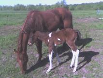 Brown Tobiano filly out of Solid Sorrel breeding stock mare